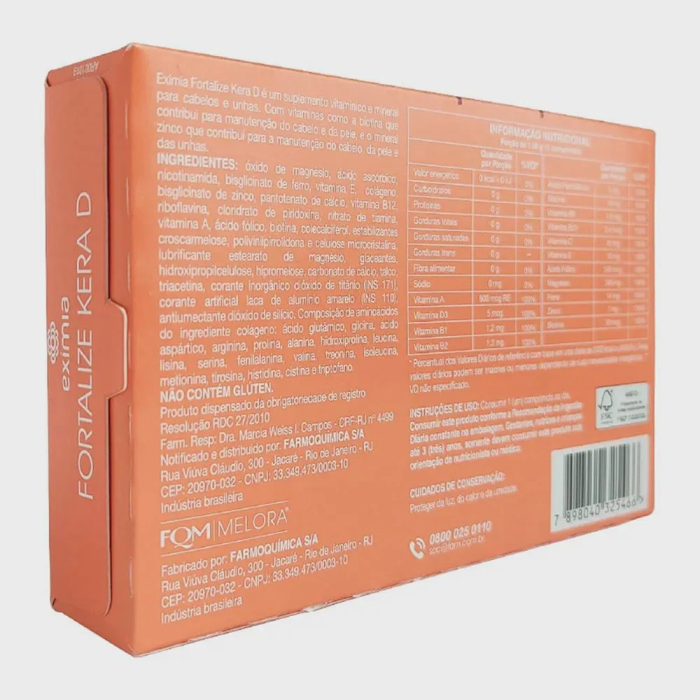 O que é o Exímia Fortalize Kera d? O Exímia Fortalize Kera D é um suplemento vitamínico composto por 11 vitaminas, que auxiliam no crescimento, fortalecimento e manutenção das unhas e dos cabelos, deixando-os mais resistentes.